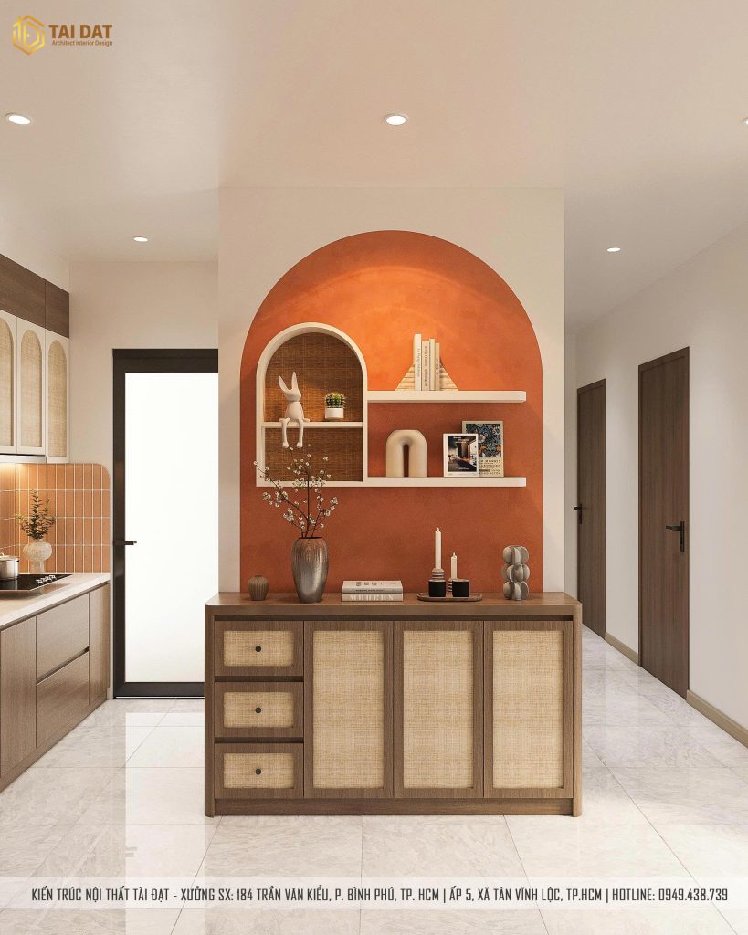 Khu vực Bếp tối ưu: Hệ tủ bếp kịch trần tận dụng tối đa diện tích lưu trữ. Sự kết hợp giữa đá marble trắng và gạch thẻ thẻ dọc màu cam đất tạo nên sự tương phản thú vị nhưng vẫn hài hòa.