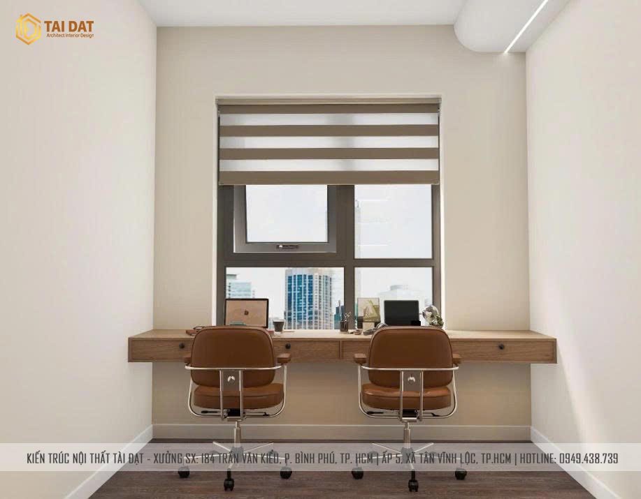 - Góc học tập và làm việc lý tưởng: Tận dụng khoảng trống gần cửa sổ, chúng tôi bố trí bàn học tập và làm việc dài dành cho hai người, với view nhìn đắt giá từ căn hộ. Vị trí này đón trọn ánh sáng mặt trời, kết hợp cùng rèm cầu vồng để điều tiết độ sáng, tạo môi trường làm việc tập trung và đầy năng lượng.