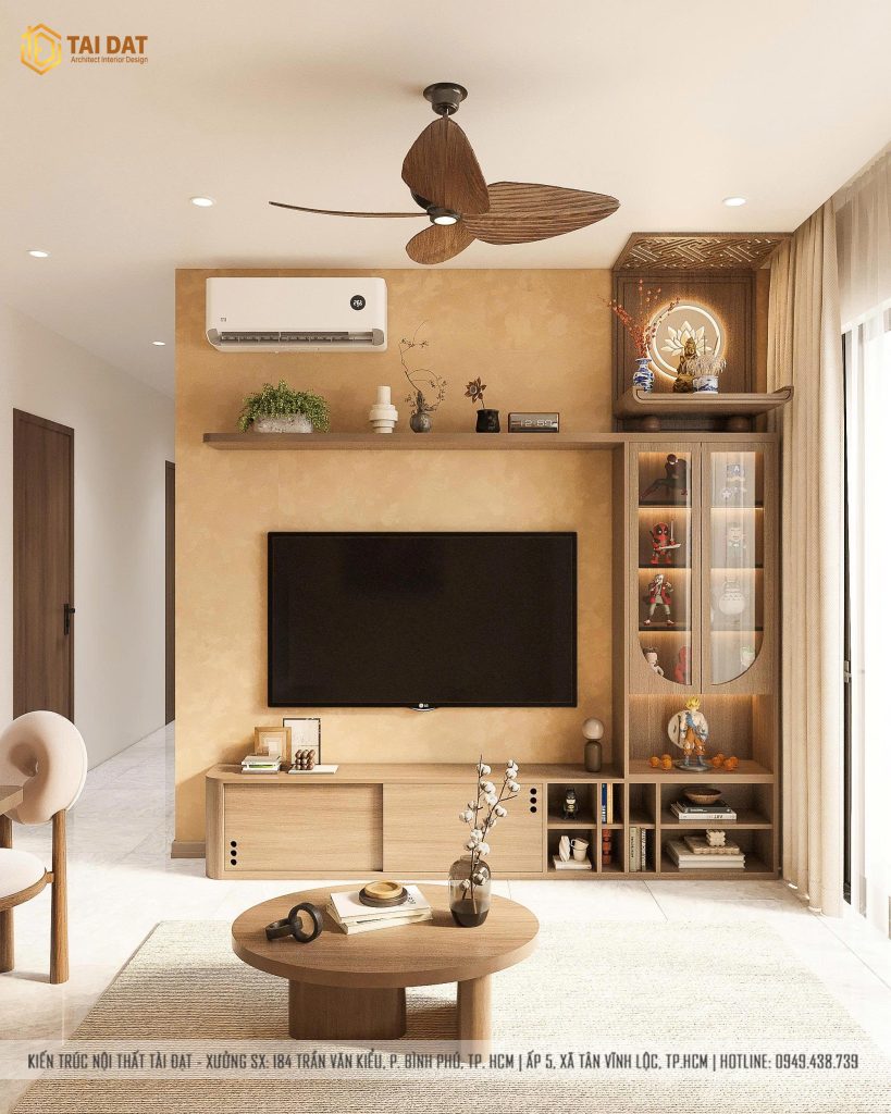 Hệ tủ TV tích hợp bàn thờ: Một giải pháp tinh tế dành cho gia đình Việt. Khu vực thờ tự được thiết kế trang nghiêm, đồng bộ với hệ tủ trang trí và kệ sách, giúp không gian khách trở nên gọn gàng và thẩm mỹ hơn.