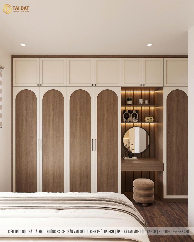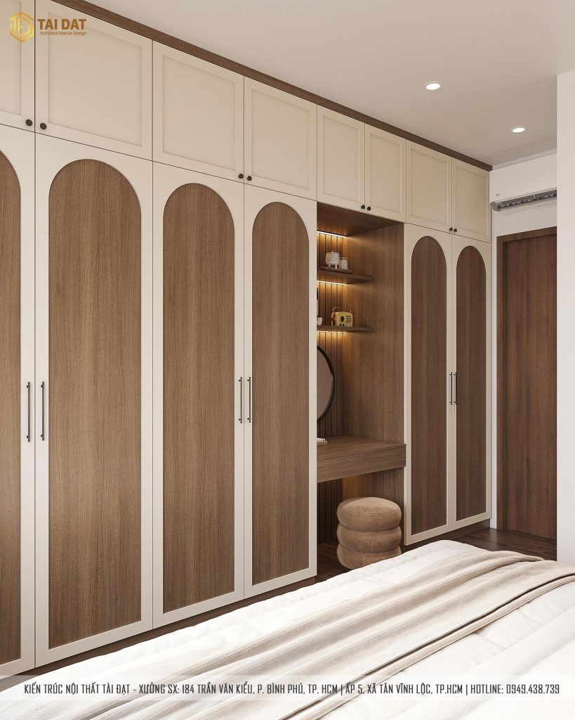 Hệ tủ kịch trần thông minh: Tủ quần áo được thiết kế với những cánh cửa vòm gỗ, tích hợp bàn trang điểm nhỏ gọn bên trong, giúp tối ưu diện tích mặt sàn mà vẫn đảm bảo đầy đủ công năng.