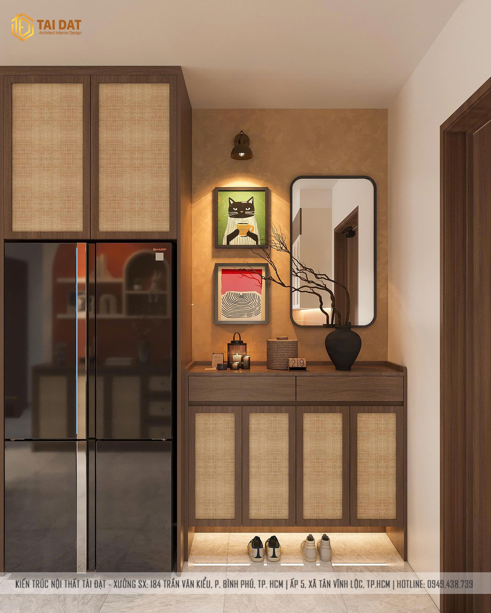 Hệ tủ giày thông minh: Tủ kịch trần được phối hợp giữa gỗ và mây tre đan (rattan), tạo khe thoáng tự nhiên cho đồ dùng bên trong.