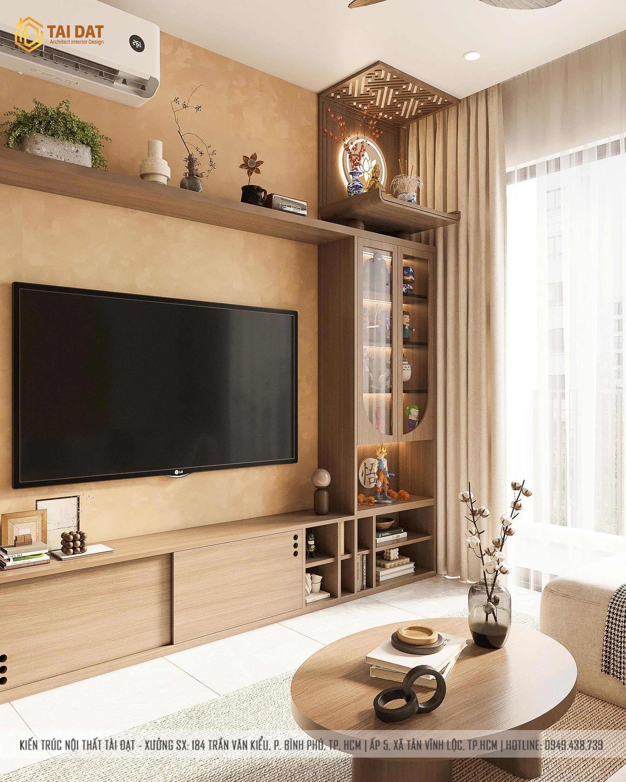 Hệ tủ TV tích hợp bàn thờ: Một giải pháp tinh tế dành cho gia đình Việt. Khu vực thờ tự được thiết kế trang nghiêm, đồng bộ với hệ tủ trang trí và kệ sách, giúp không gian khách trở nên gọn gàng và thẩm mỹ hơn.