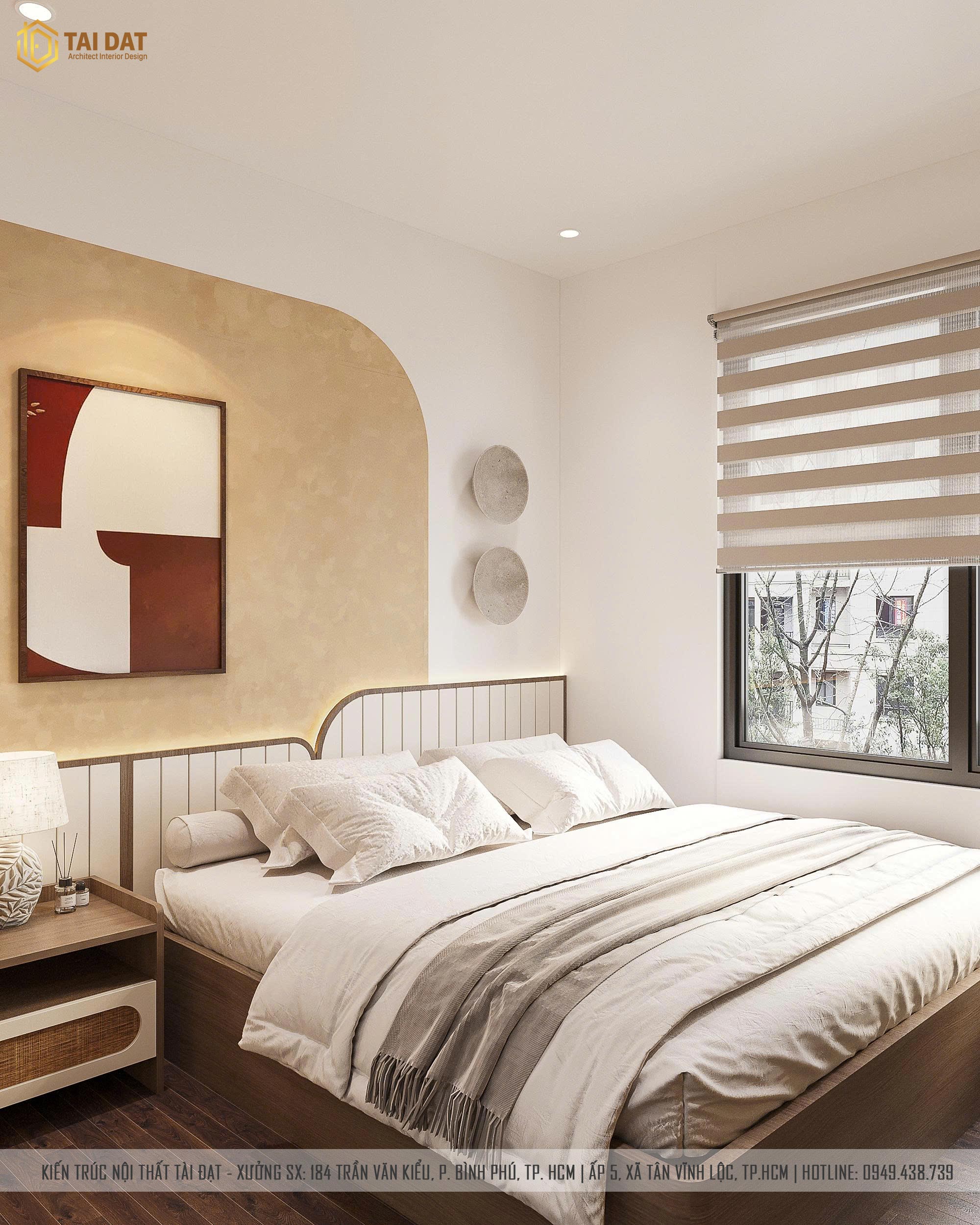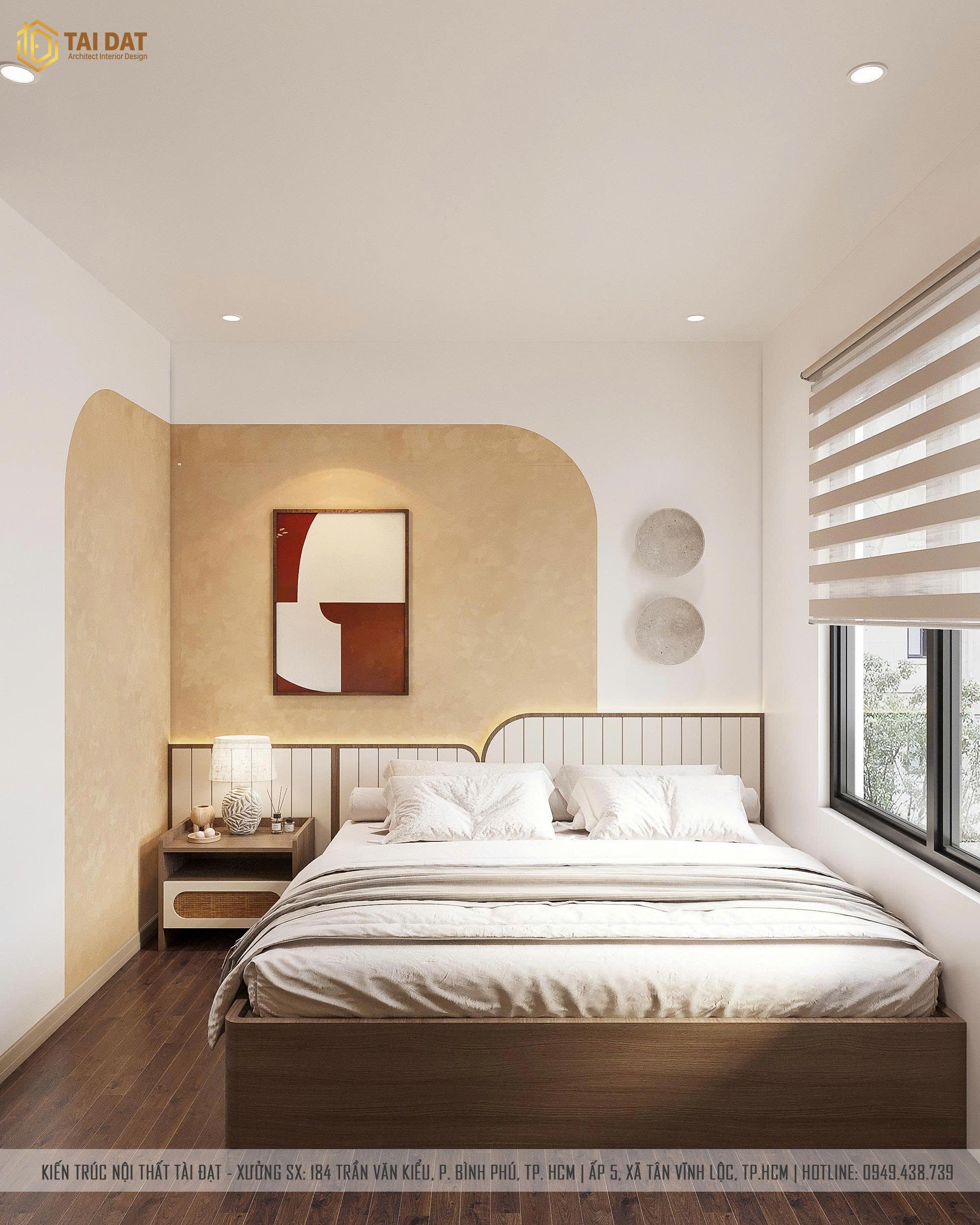 - Bố cục đối xứng: Mảng tường đầu giường được sơn hiệu ứng màu đất với hình khối vòm lớn, tạo chiều sâu cho căn phòng.